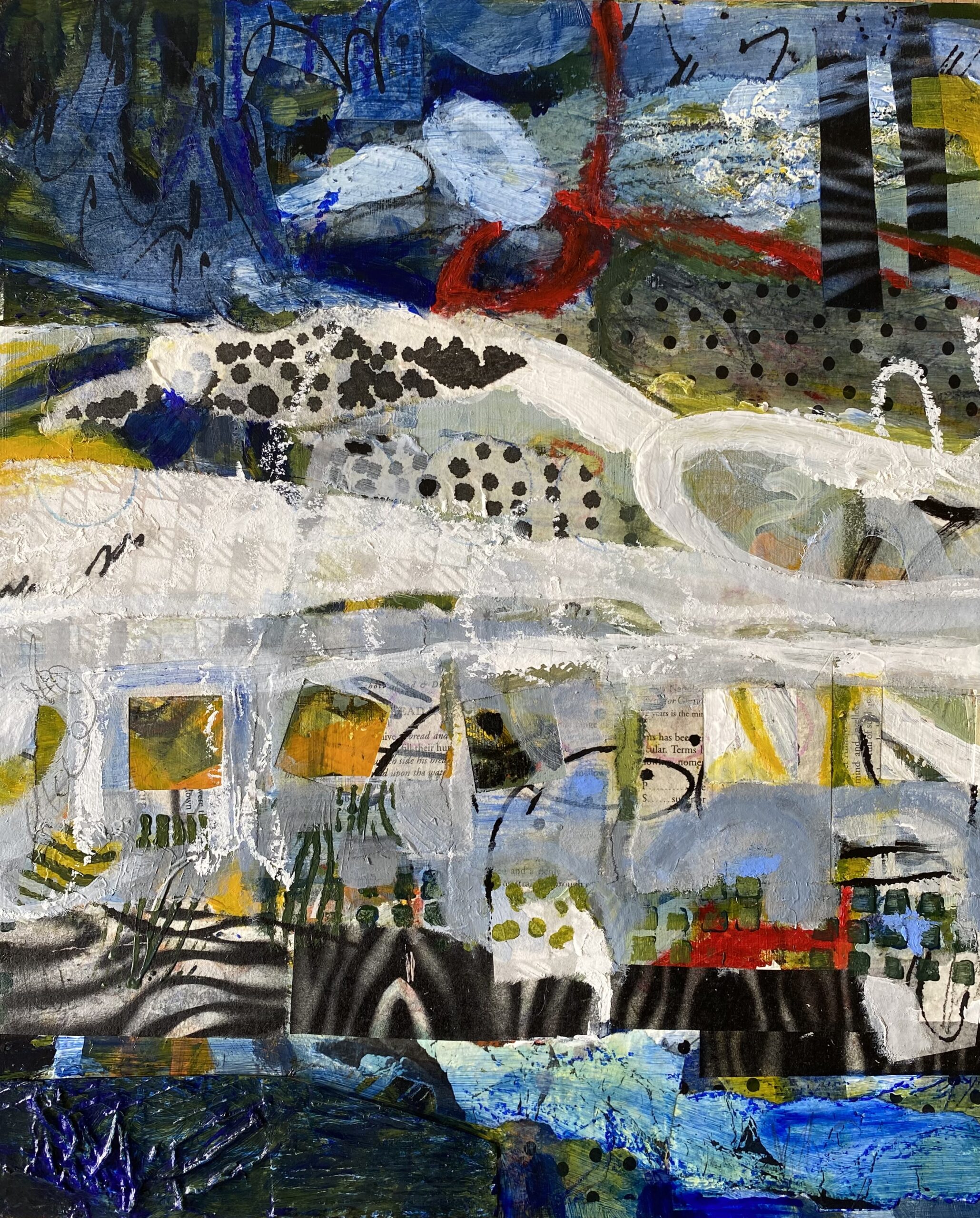 Acrylic and mixed media including rice paper and string. 28cm x 30 cm Collage prints and own marks on rice paper and book papers. Acrylic on birch plywood board, framed in Tasmanian Oak, under glass