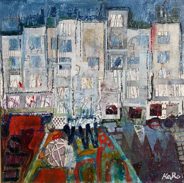 40cm x 40cm acrylic and mixed media on wood panels, framed in contemporary Tasmanian oak $700 each plus PnP